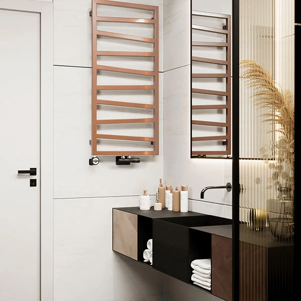 Sèche-serviette électrique moderne teinte cuivre lumineux avec barreaux asymétriques