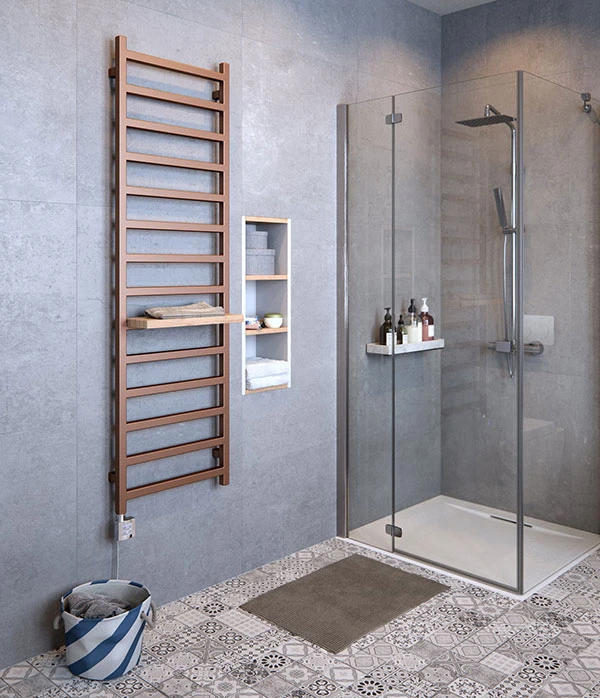 • Mariez la nuance avec des matériaux bruts comme des briques de pierres rouges, ou un carrelage gris anthracite pour mettre en valeur votre sèche-serviette haut de gamme